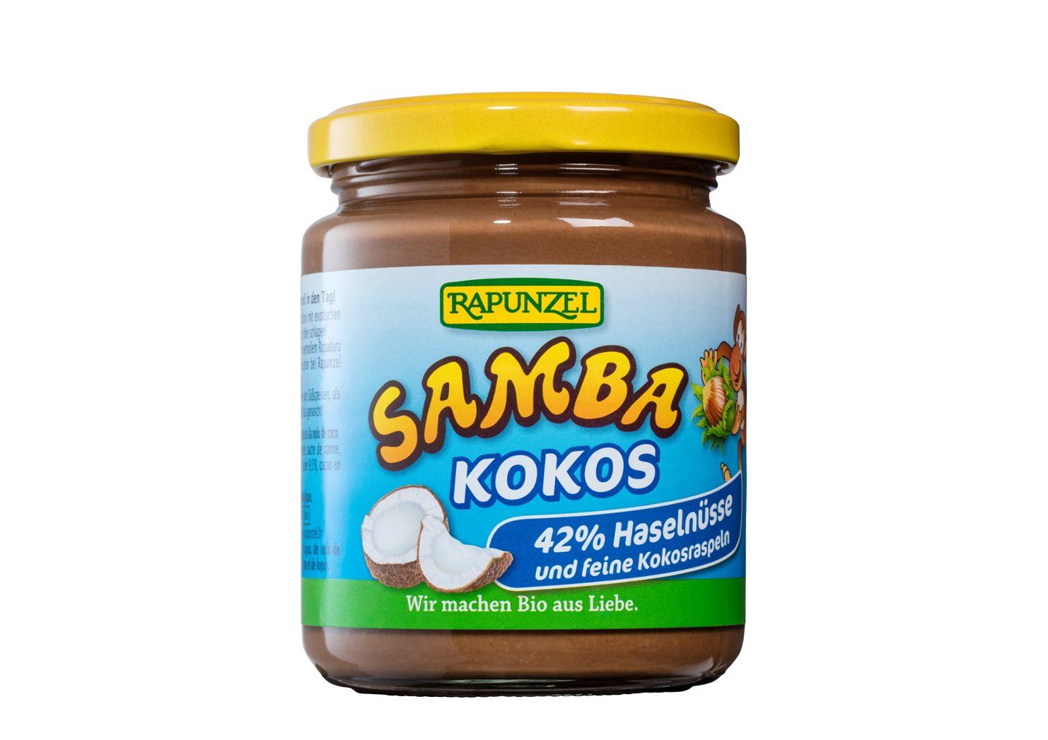 Starten Sie mit Samba Kokos schwungvoll in den Tag! 42% aromatisch geröstete Haselnüsse in Kombination mit exotischen Kokosraspeln lassen das Herz eines jeden Nuss-Fans höher schlagen! Zusammen mit edlem Kakao, Allgäuer Vollmilch und wertvollem Rapadura Vollrohrzucker werden sie zum zart schmelzenden Samba verarbeitet. Rapadura Vollrohrzucker, Cristallino Rohrzucker, Palmöl und Kakaopulver sind fair gehandelt und stammen von unseren HAND IN HAND-Partnern. Die Konsistenz ist temperaturabhängig. Bei Zimmertemperatur cremig, im Kühlschrank gelagert fest.